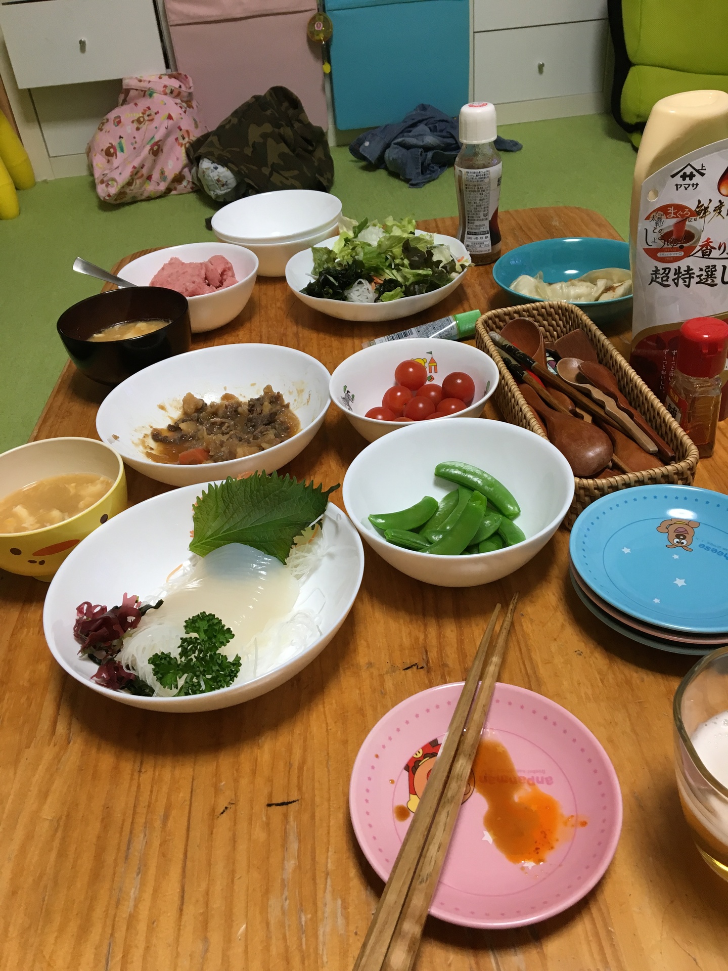 マグロ、イカ、えんどう、トマトに昨日の残りのギョウザ、一昨日の残りの肉じゃが。