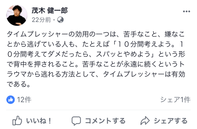 タイムプレッシャーの効用の一つは、苦手なこと、嫌なことから逃げている人も、たとえば「10分間考えよう。10分間考えてダメだったら、スパッとやめよう」という形で背中を押されること。苦手なことが永遠に続くというトラウマから逃れる方法として、タイムプレッシャーは有効である。