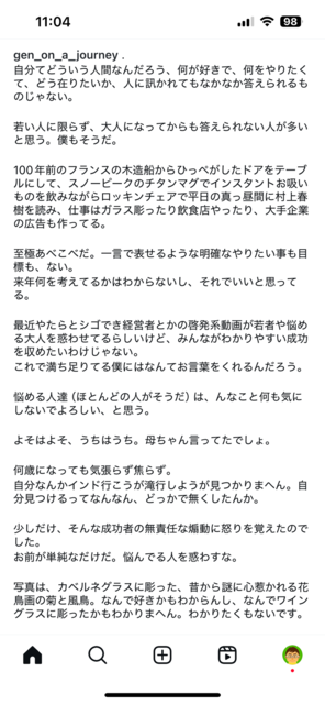 何か一つのことで成功を収めている人は単純な人だと思う ずっとひとつことをやり続けられるというのは、迷いがないということだ そのことについての迷いはあるだろうけど オレはそんなに単純じゃないんだ